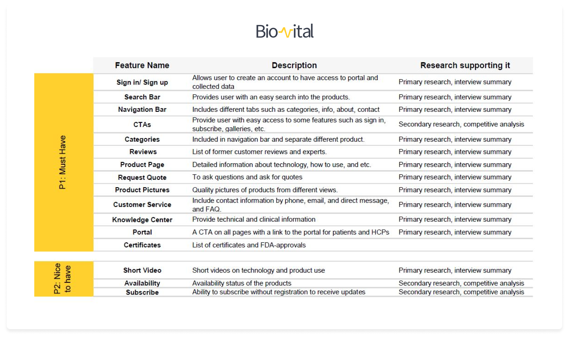 Since BioVital was a completely brand new company, I found it useful to analyze the websites of the competitors as a first step to understand the level of information and features usually provided to users.