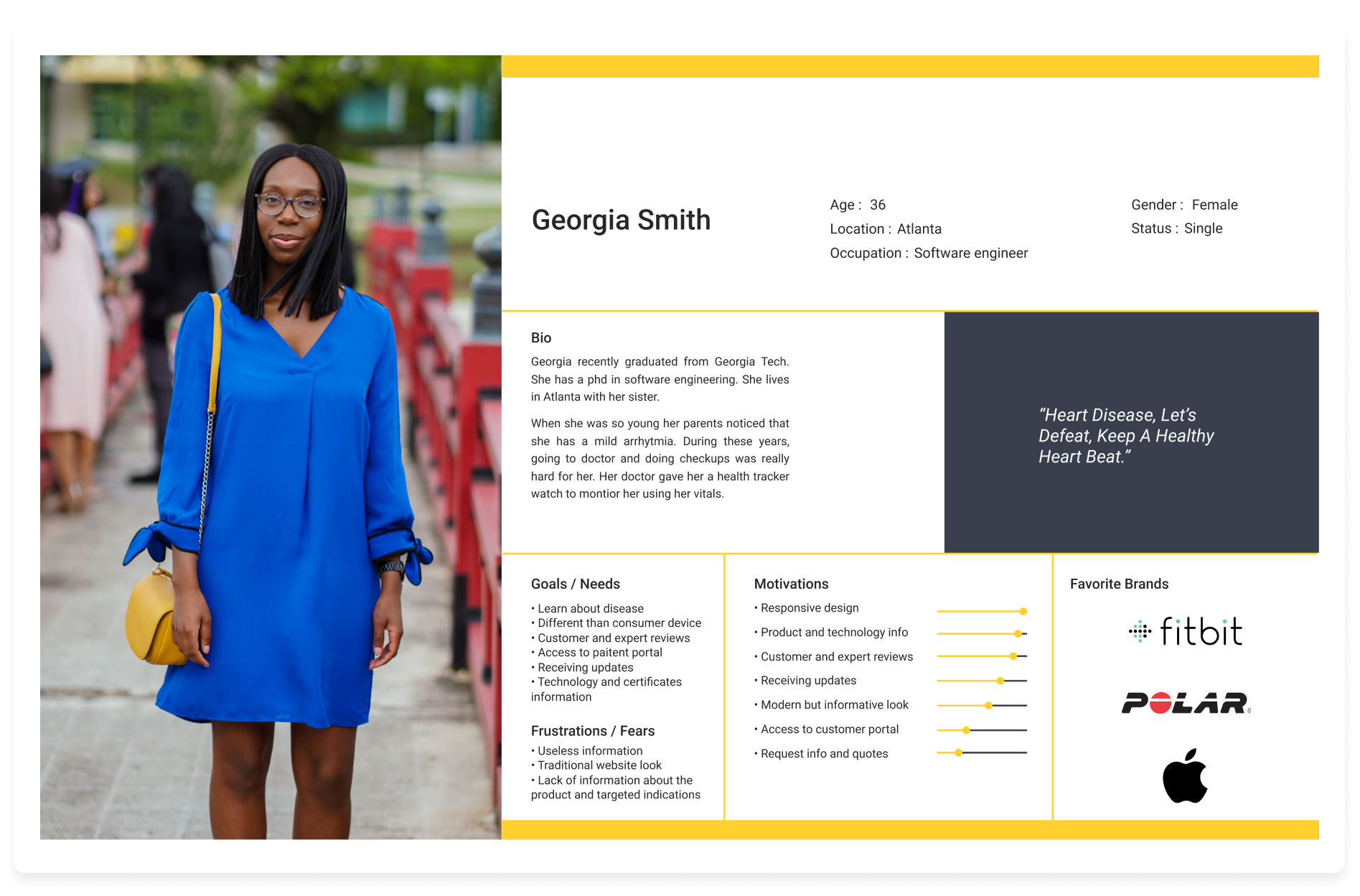 Based on my gatherings from the interviews and competitive analysis, I organized the information by creating a persona . Having a persona as a potential user and understanding the expectations, concerns, and motivations of targeted users, making it easier to think through a design that satisfies a wide range of users with different needs and fears.